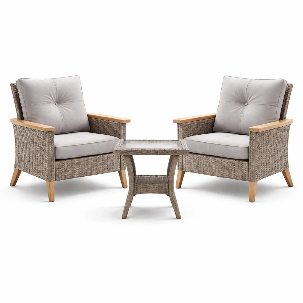 Dieses Set besteht aus zwei Stühlen und einem Tisch. Die Stühle sind aus Polyrattan mit Armlehnen aus Naturholz gefertigt. Der Tisch besteht ebenfalls aus Polyrattan und hat eine Glasplatte aus gehärtetem Glas (5 mm). Die Sitzkissen verfügen über einen Bezug aus Polyester. Der Stuhl hält einem Gewicht von bis zu 120 kg stand.