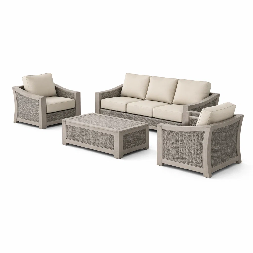 Der Rahmen besteht aus Aluminium, das Geflecht aus Polyethylen-Rattan. Die Polster sind mit Polyester bezogen und mit Schaumstoff gefüllt.