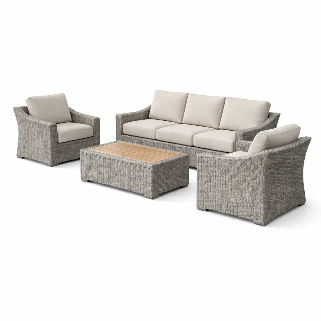 Dieses Gartenmöbel-Set enthält ein 3-Sitzer Sofa, zwei Sessel und einen Tisch aus hochwertigen Materialien. Der Rahmen besteht aus strapazierfähigem Polyrattan. Die Tischplatte ist aus Teakholz gefertigt. Die Kissen sind mit Polyester bezogen und mit Schaumstoff gefüllt.