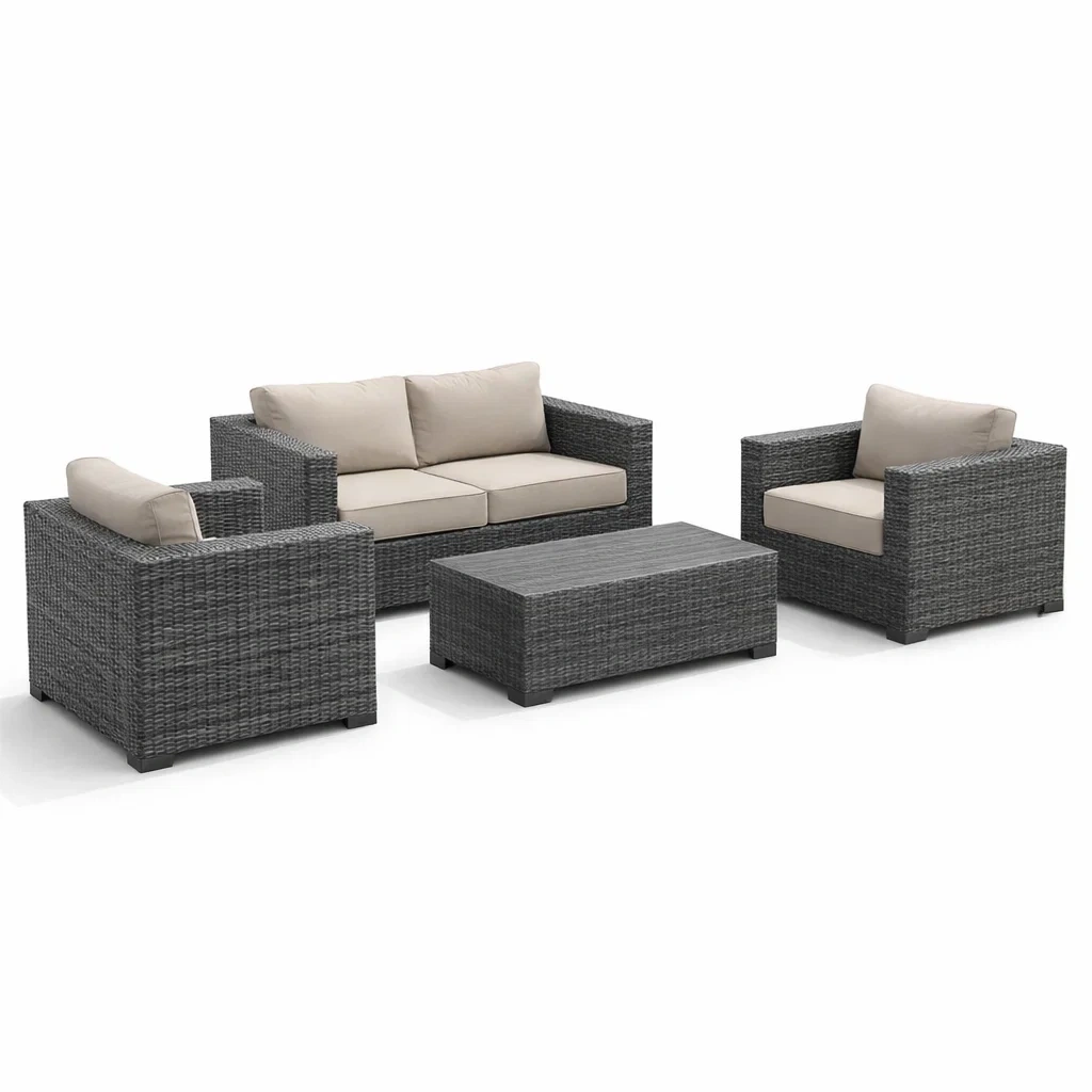 Enthaltene Komponenten: 1 Zweisitzer-Sofa, 2 Sessel, 1 Tisch